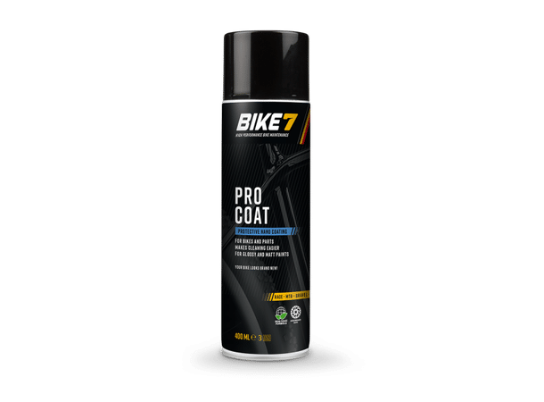 Spray Bike7 Pro Coat på din tørre sykkel. Tørk deretter av med en mikrofiberklut. Det beskyttende laget er helt herdete etter 12 timer. Etter vask med Bike7 Wash & Finish kan du også påføre Pro Coat på din våte sykkel, tørk deretter av sykkelen med en mikrofiberklut. Bike7 Pro Coat på bremseskiver vil ikke forårsake noen bremsestøy.