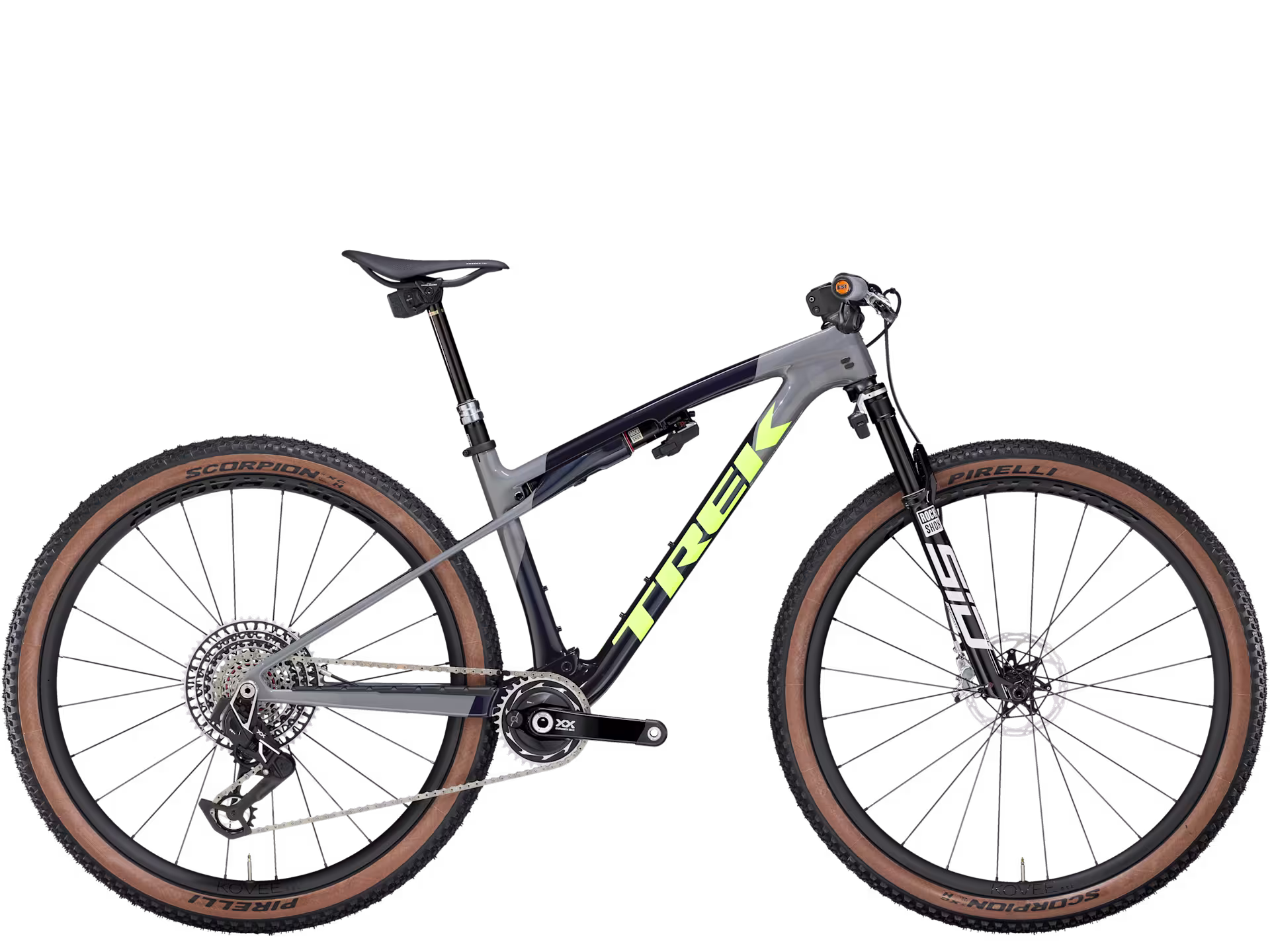 Både fram- og bakhjul er Bontrager Kovee RSL i OCLV Mountain Carbon – lette, stive og bygget for topp ytelse. Hjulene er Tubeless Ready med Boost-standard og gjennomgående akslinger for optimal presisjon og kontroll. Sykkelen leveres med Pirelli Scorpion XC Team Edition-dekk i 29×2,20″, klare for raske XC-runder med godt grep og lav rullemotstand.