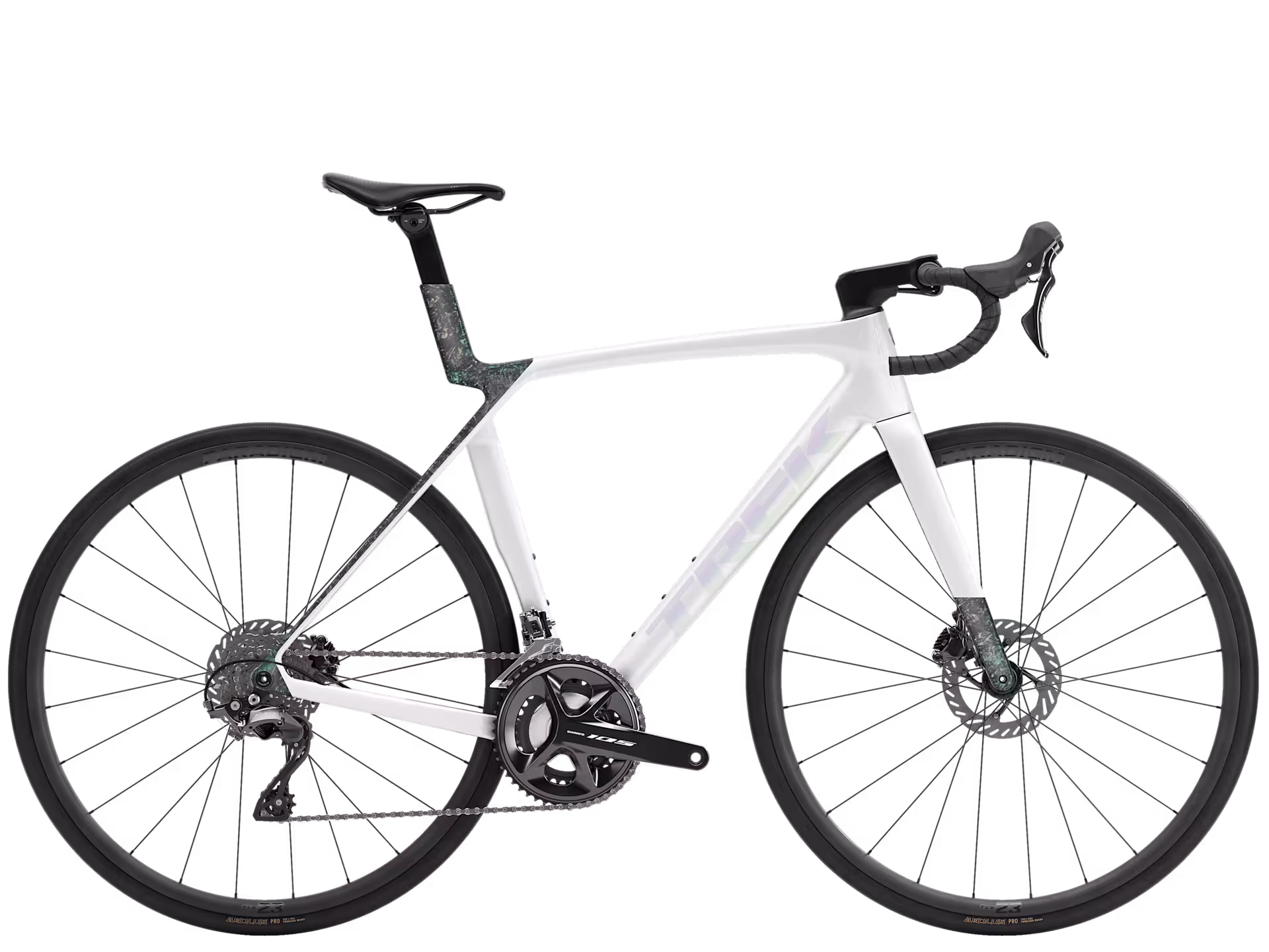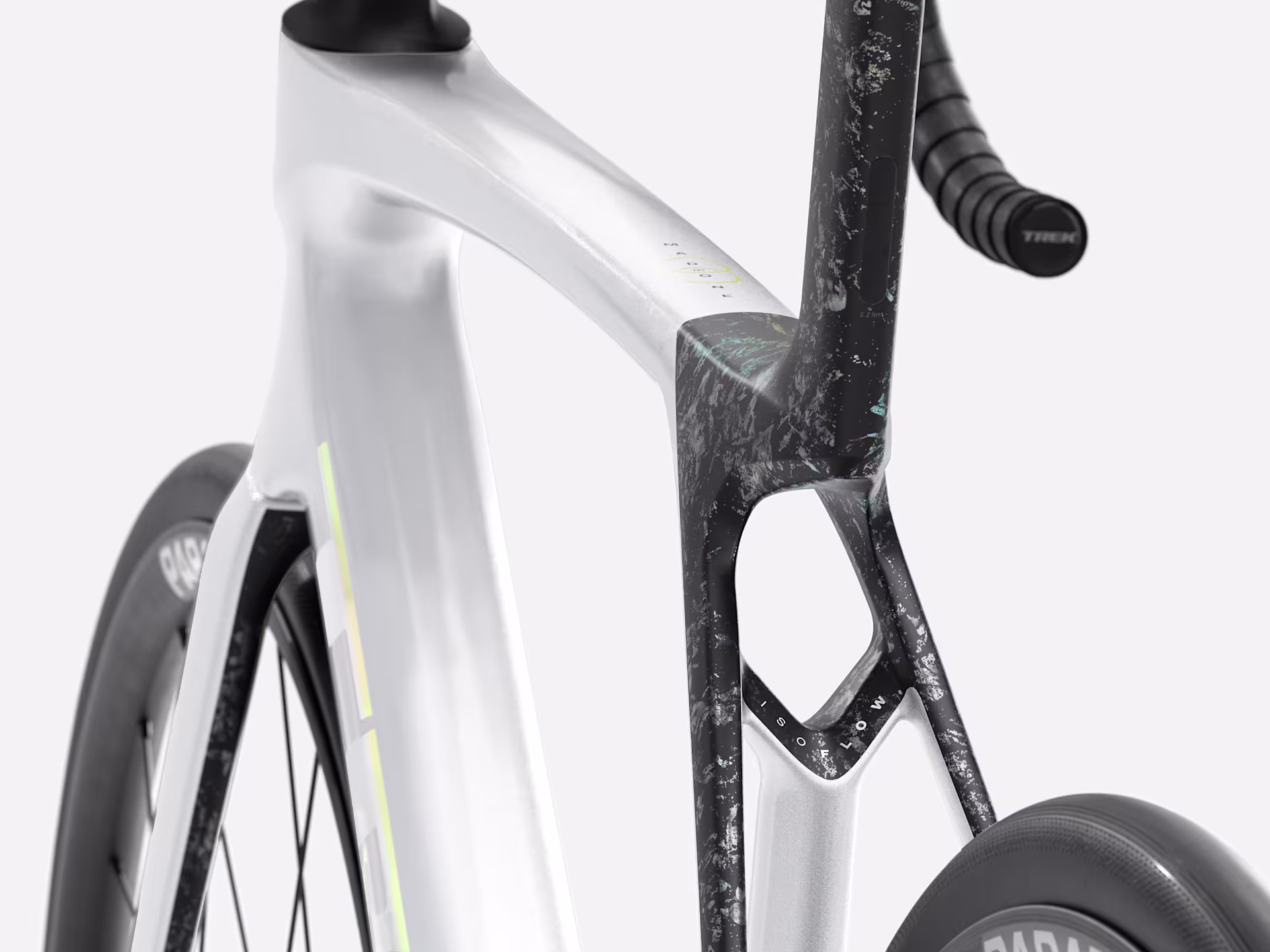 Madone Gen 8 fullkarbon, konisk kronerør i karbon, innvendig bremseføring, Flat Mount skive, 12×100 mm avfaset gjennomgående aksel